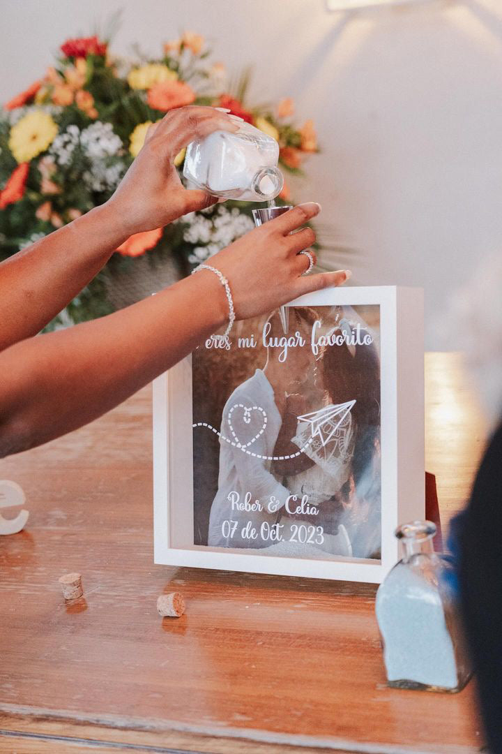 Una vez intercambiadas las alianzas, se vierte la arena de cada uno sobre un marco transparente que se puede personalizar, por ejemplo, con el nombre de la pareja y la fecha del enlace. De esta forma, una vez hayan finalizado de incorporar toda la arena en el marco, quedará una preciosa unión de ambas arenas que representa la unión entre dos personas.