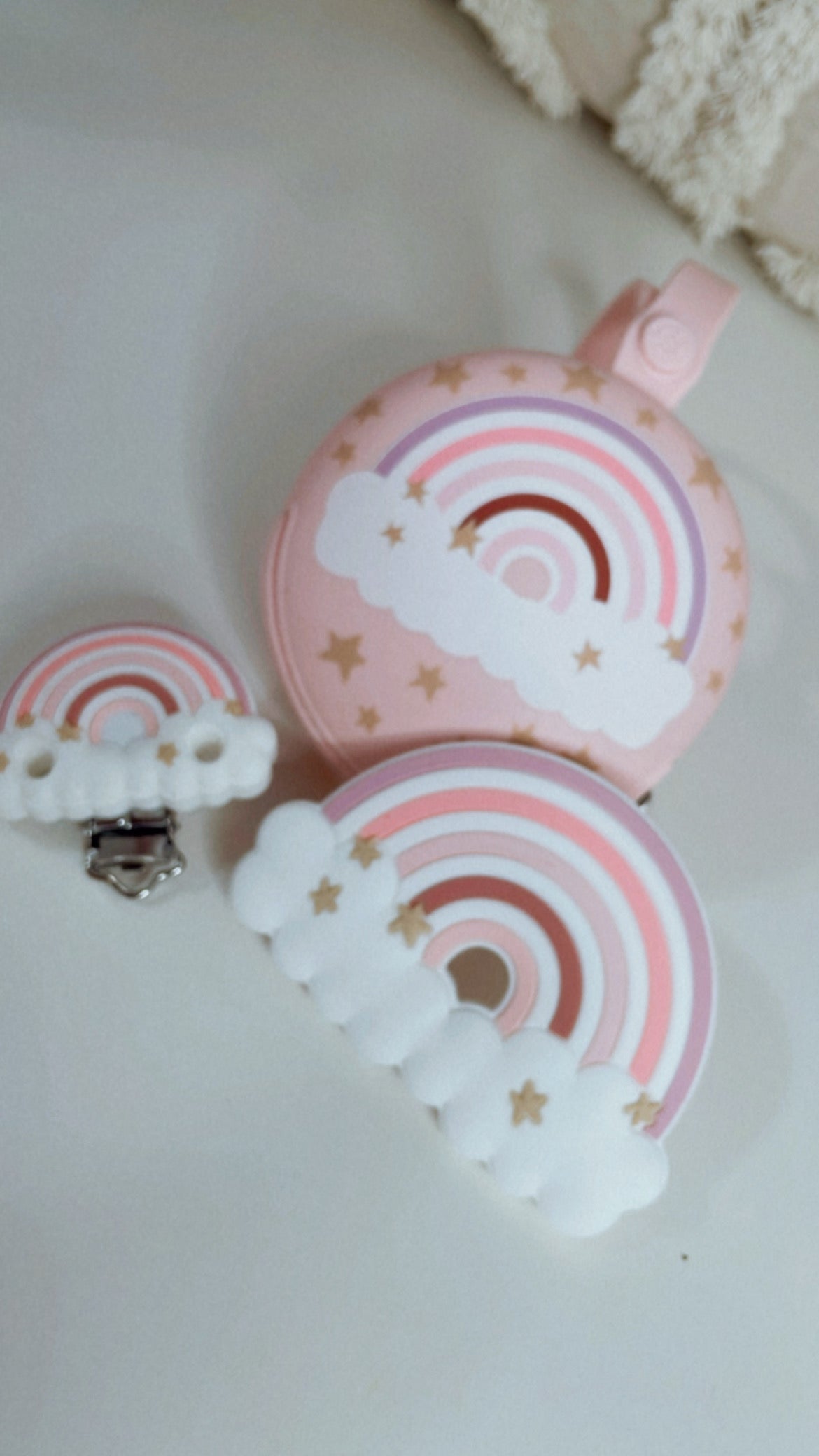 ¡Descubre nuestro encantador set de regalo con chupetero personalizado! Este conjunto incluye un chupetero con el nombre de tu pequeño, un mordedor suave y seguro, y una práctica bolsa guarda chupete, todo completamente personalizado para que sea único. Cada elemento está diseñado con amor y cuidado, y se presenta en una caja súper bonita que lleva la adorable frase "pastelito recién horneado". Es el regalo perfecto para celebrar la llegada de un nuevo bebé o para sorprender a los papás en cualquier ocasión. ¡Haz que cada momento sea especial con este set lleno de dulzura!